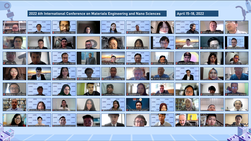 2022 6th International Conference on Materials Engineering and Nano Sciences (ICMENS 2022) was successfully held virtually during April 15-18, 2022! The conference consist of 5 keynote & invited speeches and 9 oral sessions. 79 presenters from around 18 countries gathered via online platform and made excellent presentations. With everyone's support, the 4-day conference was successfully hosted online.